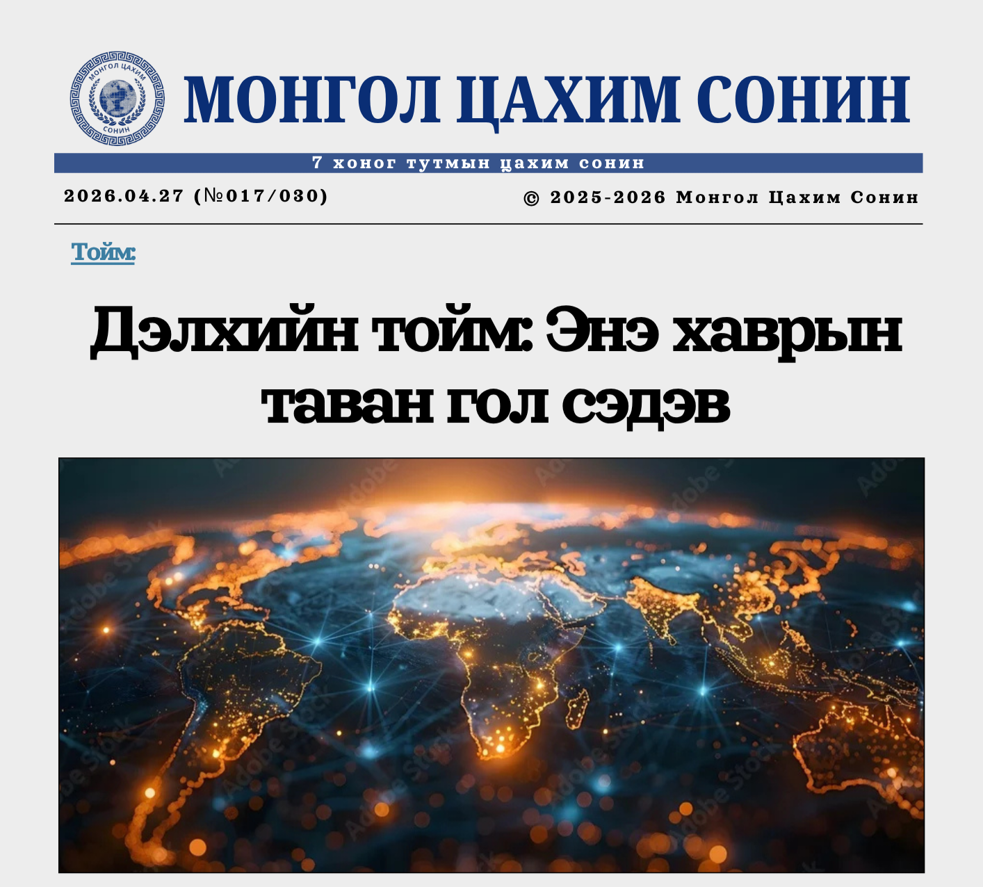 Монголын сэтгүүлзүйн шинэ хэв маяг, дижитал мэдээний соёл. E-Paper сониныг нэвтрүүлж байна. Жилд 52 дугаар, улиралд 13 дугаар гардаг 7 хоног тутмын дижитал сонин юм.